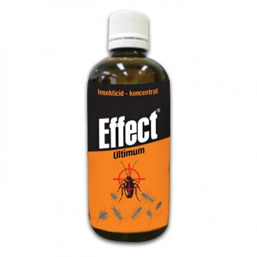 Effect Ultimum este un insecticid concentrat cu actiune de contact si efect dublu: – efect imediat (knock- down efect) – efect de durata (actioneaza pe o durata mai mare de 5 saptamani); Insecticidul poate fi folosit atat pe suprafete netede, cat si pe suprafete poroase. Poate fi folosit si pentru ceata rece (ULV), unde consumul este de 10 ori mai mic pentru obtinerea aceluiasi efect. Prin urmare, se poate folosi pentru protejarea gospodariei si a altor cladiri. Pe fatade, in jurul ferestrelor, pe suprafete de lemn, piatra sau beton, in jurul si in interiorul grajdurilor, hambarelor, soproanelor, in crapaturi unde exista insect, in mijloace de transport marfa,containere pentru depozitarea deseurilor etc. Produsul este stabil la lumina soarelui si, prin urmare, se poate folosi atat in spatiile interioare, cat si in cele exterioare. Effect Ultimum este destinat combaterii insectelor zburatoare si taratoare. Este potrivit pentru exterminarea populatiilor mai mari si mai mici de insecte. Nu are miros, nu lasa urme si este rezistent la lumina soarelui. Dozare recomandata: Insecte taratoare: pentru o suprafata de 100 m² se amesteca 50 ml solutie la 5 l de apa insecte zburatoare: pentru o suprafata de 100 m² se amesteca 25 ml solutie la 5 l de apa Substante active: Tetrametrina 1% (10 g/l) Permetrina 6% (60 g/l) Piperonilbutoxid 18% (180 g/l)