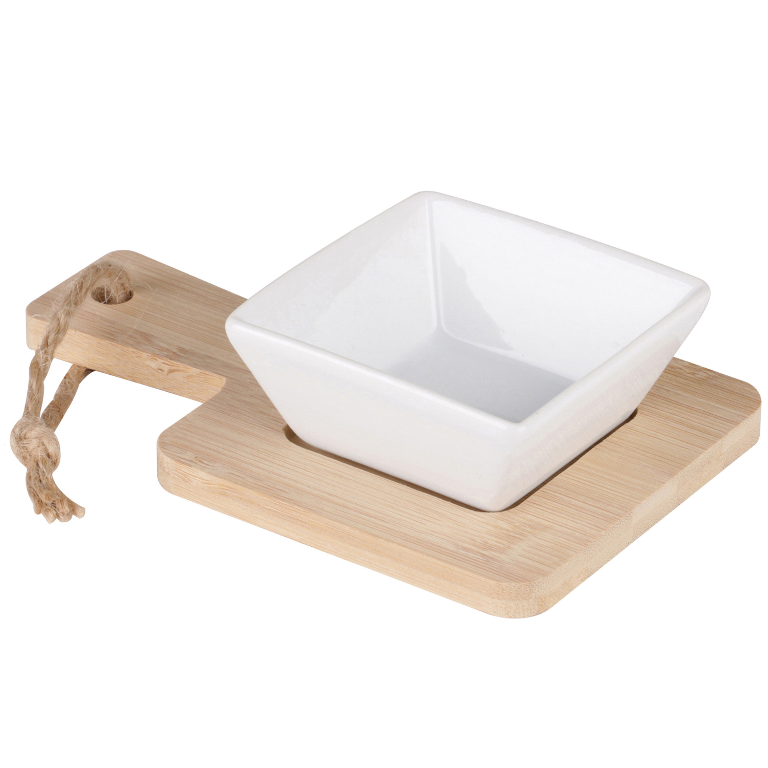 Bol portelan cu suport bambus servire aperitive. Bolul de portelan poate fi folosit pentru servirea sosurilor sau a diverselor aperitive. Suportul de bambus are maner si poate fi usor de manevrat. Dimensiuni : 16,5 cm x 10 cm Material : portelan + bambus Bolul este fabricat din portelan de inalta calitate si vine insotit de un suport din bambus. Aceasta combinatie de materiale confera un aspect elegant si modern bolului, in timp ce suportul din bambus il face si mai practic. Acesta este ideal pentru a servi diverse aperitive, cum ar fi branzeturi, fructe, nuci sau alte gustari. In plus, datorita materialelor de calitate si designului sau atragator, bolul cu suport bambus poate fi o piesa de decor excelenta pentru orice masa festiva sau eveniment special.