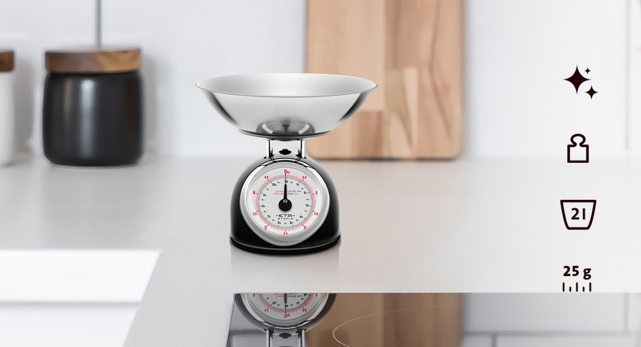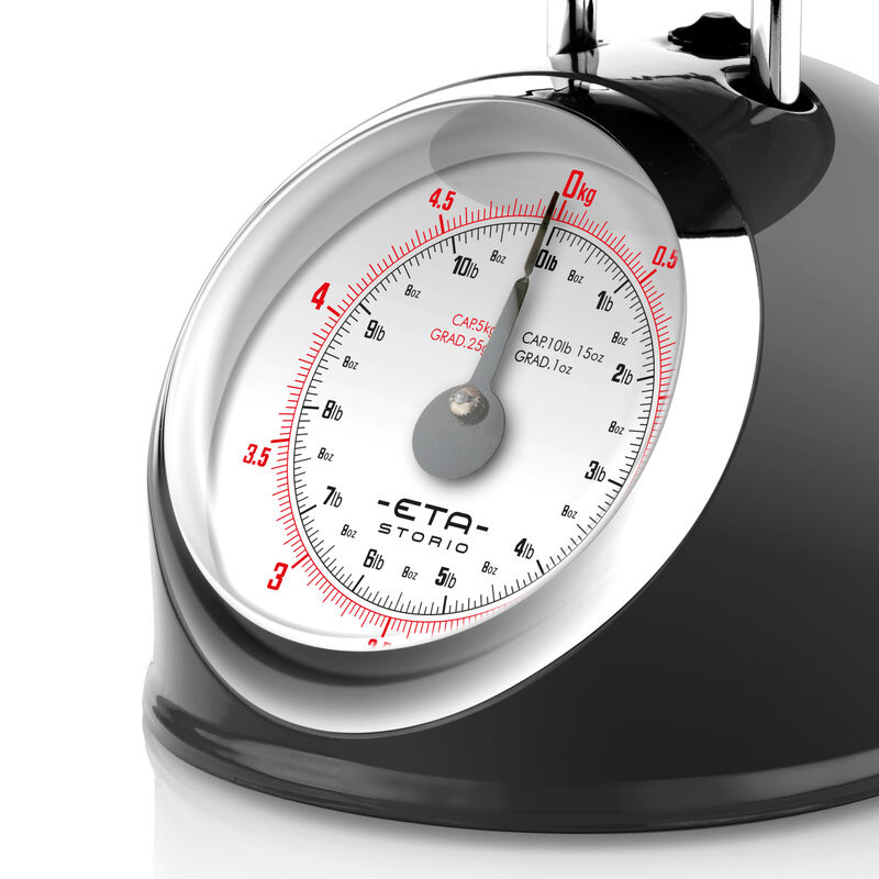 Cantarul de bucatarie a fost mult timp o parte indispensabila a oricarei bucatarii bine echipate. Cantarul din metal in designul retro din colectia ETA STORIO este foarte asemanator cu cel al bunicii, dar este, de asemenea, foarte popular printre bucatarii moderni. Combinatie echilibrata de functii practice si design retro ETA STORIO ofera tot ce aveti nevoie pentru cantarirea materiilor prime necesare la reteta pentru mancare. Un vas mare din otel inoxidabil cu un volum de 2 litri este intotdeauna pregatit sa cantareasca pana la 5 kilograme de alimente. Greutatea rezultata este citita cu usurinta pe un cadran clar cu o scala impartita la 25 de grame . Daca doriti sa gatiti dupa retete straine, veti aprecia posibilitatea de a citi cantitatea cantarita si in unitatile lb (pound) sau oz (uncii). Datorita designului durabil din metal, cantarul este usor de pastrat curat, iar picioarele anti-alunecare asigura stabilitatea pe suprafata de lucru. Avantajul cantarelor mecanice este ca nu au nevoie de baterie pentru a functiona si sunt mai usor de reparat, neavand componente electronice. Deasemenea acestea sunt fiabile in timp, durabile si sunt foarte usor de utilizat. Dimensiuni aparat Dimensiuni ambalaj Lungime 25 cm Lungime 26.5 cm Adancime 25 cm Adancime 26 cm Inaltime 21 cm Inaltime 19 cm Greutate 1.03 kg Greutate 1.43 kg