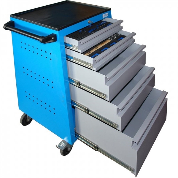Carucior de atelier profesional proiectat din otel si acoperit cu pulbere de inalta calitate , 2 Role fixe cu anvelope din cauciuc solid , 2 Role pivotante (1x cu incuietoare) , Capacitate de transport pe ricin: 50 kg , 5 Sertare 450 mm latime, 385 mm adancime, inaltime: 2 x 70 mm, 2 x 150 mm, 1 x 230 mm , Rama din plastic in jur si insertii de cauciuc , Capacitatea maxima de incarcare per sertar: 25 kg , Complet cu cilindru de blocare pentru inchidere centralizata , Fete perforate 10x10x38 mm pentru a fixa diverse cutii si suporturi pentru scule (disponibil ca accesoriu). , Latime totala (cu maner de conducere) 650 mm, adancime (sus) 440 mm, adancimea (partea de jos, cu roti) 610 mm, inaltime 910 mm, , Greutate: 35 kg Caruciorul de unelte este echipat cu urmatoarele instrumente: , Cheie reglabila , Maner moale de securitate si ejector pentru schimbarea usoara a prizelor cu insertii , Double 6-kantiene SW: 10 12 13 14 15 16 17 18 19 20 21 22 23 24 25 26 27 30 32 mm , Adaptor 1 2 50 mm pana la poligon 1 2 4-kant pentru lucrul in unghi , Extensie de 125 mm (4-kant poligon) , Bara intrerupator 1 2 de 450 mm , Articulatie universala , T-maner , Mufa Spark 21 16mm , Chei combinate 8 10 11 12 13 14 17 19 22 , surubelnita , surubelnita transversala , Tester de tensiune , Cleste de dezizolare pentru cabluri , Cleste de pompa de apa , Cleste , Clesti izolati , Ciocan , Taietor lateral , Foarfece universale , Cutit universal , Set sertizat , Cheie reglabila 0-30 mm cu scala in inch , Ratchet cu schimbare de parghie si maner moale , Prize duble 6-kant SW: .. 4 4.5 5.0 5.5 6 7 8 9 10 11 12 13 mm , surubelnite: 1,5 2 2,5 3 4 5 6 mm , Phillips: PH. 0 1 2 3 4 , PZ .: 0 1 2 3 , TX 10 15 20 25 27 30 , Bitii: 3 4 4.5 5 5.5 6 7 mm , Extensii: 50 100 mm , Extensie flexibila: 150mm , Adaptor BIT , 1 x universal comun , 1 x maner T , Maner rotativ, cu tija de frunte , Depozite compuse din poliuretan extrem de durabil.
