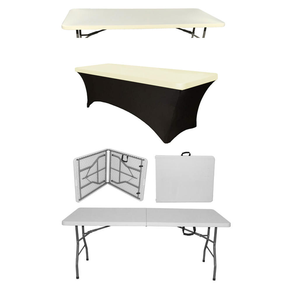 CULINARO Set masa catering pliabila tip valiza, dreptunghiulara 180x76xh74cm, husa neagra si capac elastic ivory. Setul contine: 1 x masa pliabila dreptunghiulara tip valiza 180x76xh74cm 1 x husa neagra 1 x capac textil elastic ivory