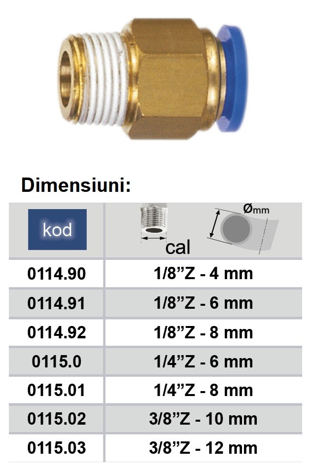 Cupla dreapta rapida cu diametru Ø6mm si filet exterior 1/8″ Push-in ADLER MA0114.91 Cupla rapida cu diametru Ø6 si filet exterior 1/8″ Push-in ADLER Aceasta cupla este recomandata pentru furtune pneumatice. Adancime de prindere: 15mm Dimensiune filet: 1/8″ Lungime filet: 11mm Presiune maxima 10 Bar Greutate 15 Gr. Destinat uzului Profesional Marca SHPI Italy Diametru interior 6 mm Culoarea Auriu Racordare 1/8″ Material: alama, plastic Scop: instalații pneumatice Filetele sunt acoperite cu teflon, astfel încât nu este necesară o sigilare suplimentară. Armături automate pentru construcția instalațiilor pneumatice și automatizări industriale pe bază de conducte de montare dreaptă din poliuretan – PU, polietilenă – PE, poliamidă – PA. Foarte des utilizate în mașinile și dispozitivele pneumatice. Conectoarele AUTO sunt fabricate din alamă și plastic. Soclurile pentru cabluri au mici „dinți” care se fixează pe cablul introdus, scoaterea cablului este posibilă doar prin apăsarea inelului albastru din jurul soclului.
