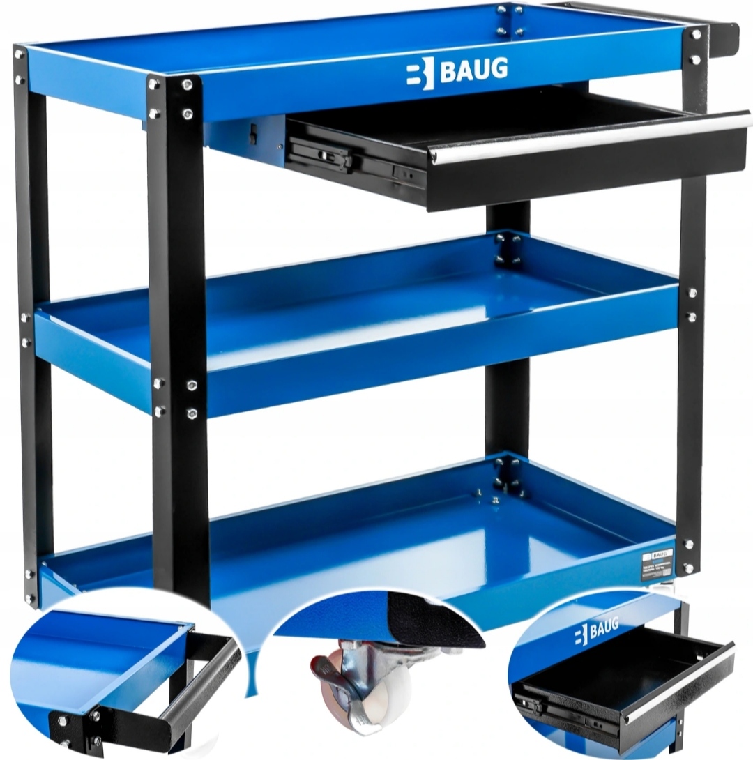 Dulap de scule cu sertar pentru atelier Baug COD PRODUS: PowerX_1944 DATE TEHNICE: latime fara maner – 70 cm (78 cm cu manere) adâncime – 35 cm inaltime – 74 cm capacitate de transport – 136 kg adâncimea raftului – 5 cm distanța dintre rafturi – 26 cm 4 roti pe rulment, inclusiv 2 pivotante 1 roata cu frana sertar (39 cm lățime, 30 cm adâncime, 5,5 cm înălțime) SERTAR: latime – 39 cm adâncime – 30 cm înălțime – 5,5 cm B3900 Caracteristici: Culoare: Negru/Albastru Tip produs: raft Pentru: Depozitare Caracteristici cheie: sertar Material: metal