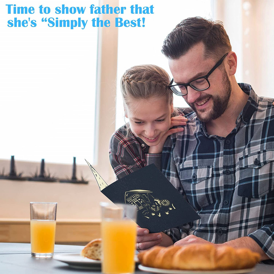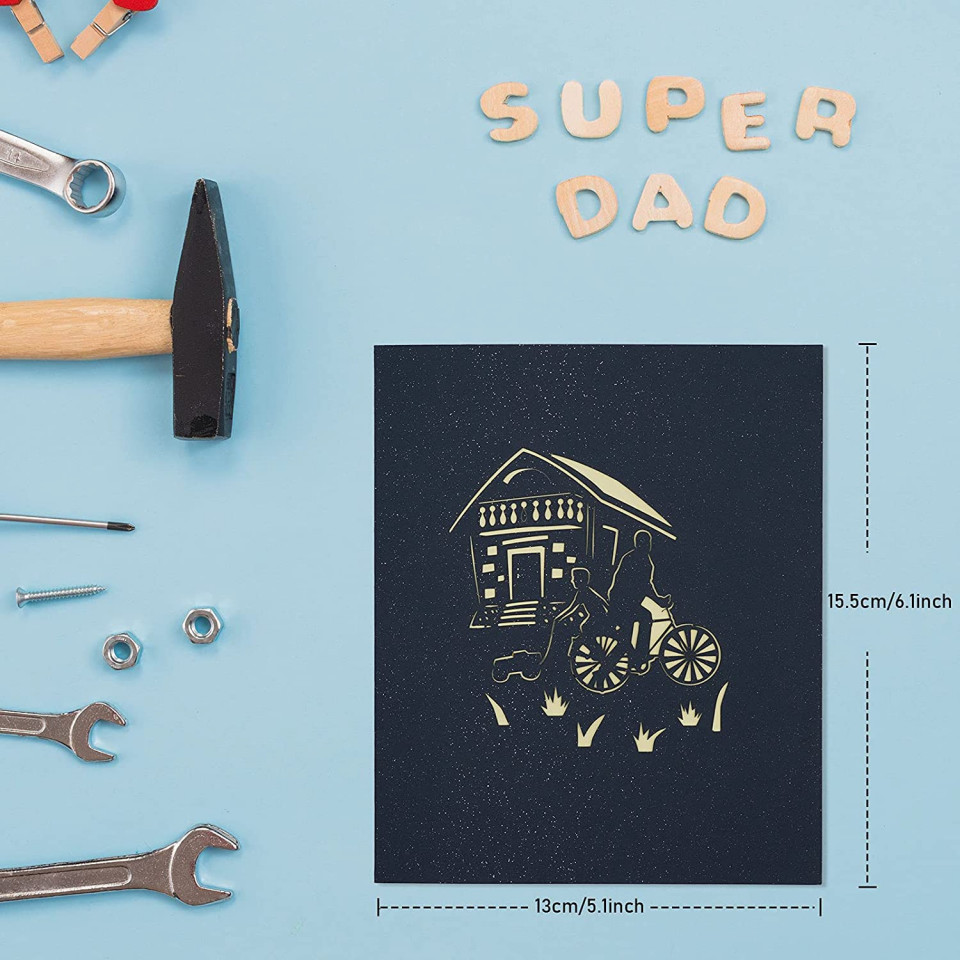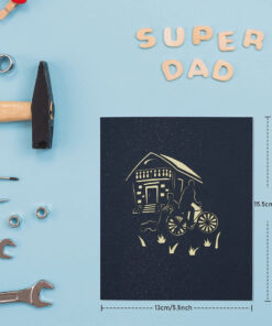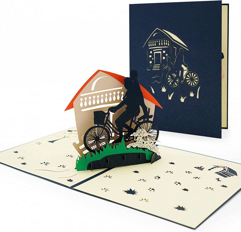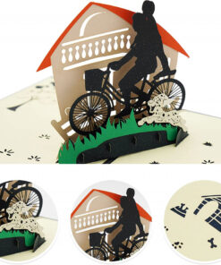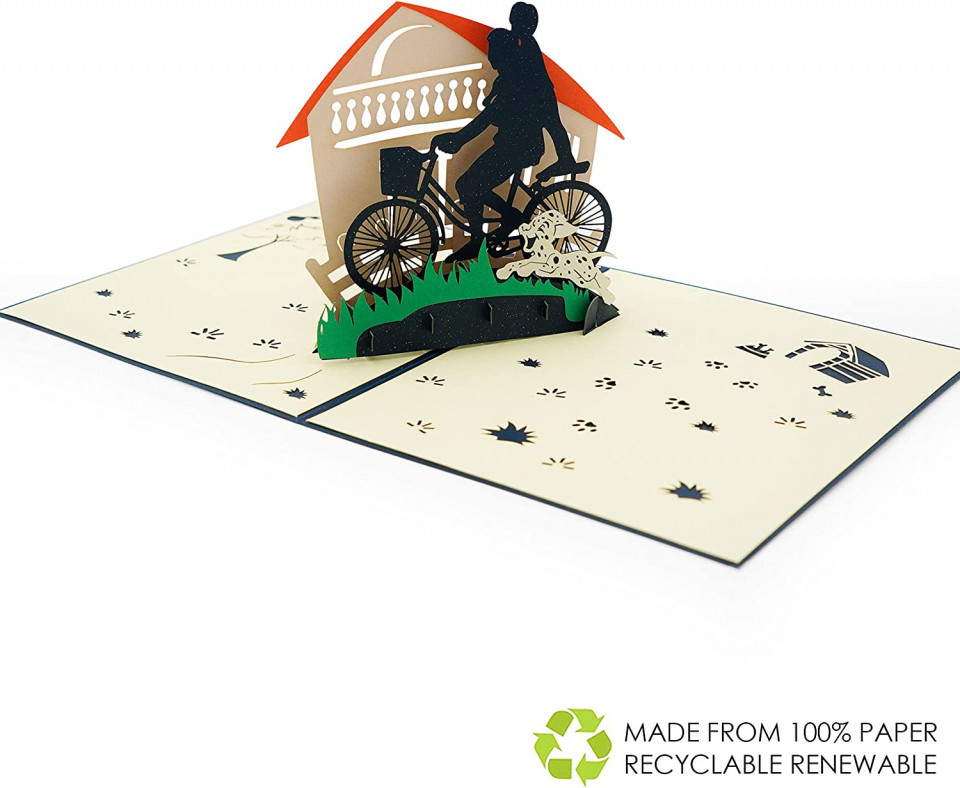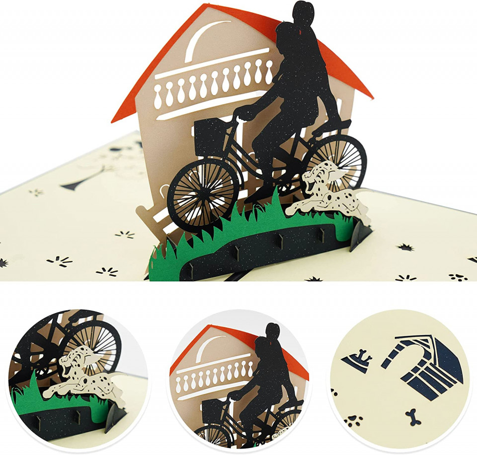Felicitare de zi de naștere cu design unic: partea din față a acestei felicitări pop-up 3D are o copertă de culoare șampanie cu un model creativ tăiat în hârtie; la deschidere, apare un model cald de scena de ciclism, impodobit cu o casa frumoasa, un caine dragut Detalii: Material: hartie Culoare: multicolor Dimernsiune: 15 x 13 x 1 cm