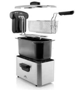 Friteuza ETA Fritola 3172 din otel inoxidabil este un aparat de prajit care nu ar trebui sa lipseasca din bucataria dumneavoastra. Cu ajutorul ei se poate prepara cu usurinta o gama larga de feluri de mancare delicioase, la fel de bune ca la restaurant. Aparatul ofera un control continuu al temperaturii intre 150 si 190° C si o cuva de 3 litri cu suprafata emailata .Doua indicatoare luminoase sunt de foarte mare ajutor: primul se aprinde la pornire indicand functionarea si al doilea indica faptul ca a fost atinsa temperatura setata pentru ulei. Modelul este echipat cu picioare antiderapante, ofera o putere de intrare de 2000 W si are un cablu de alimentare lung de 1 metru Datorita puterii mari de 2.000 W , uleiul se incalzeste rapid la temperatura dorita, pe care o puteti regla usor cu ajutorul butonului rotativ. Capacul detasabil si manerele izolate termic asigura o manipulare confortabila si picioarele antiderapante asigura stabilitatea pe suprafata de lucru. Intretinere usoara si siguranta maxima Intretinerea friteuzei este deosebit de usoara datorita elementului de incalzire detasabil. Dupa ce il scoateti, puteti introduce toate celelalte parti compunente in masina de spalat vase. In vederea depozitarii, spatiul pentru stocarea cablului de alimentare este foarte util. Protectia impotriva supraincalzirii este asigurata de o siguranta termica. Dupa folosire, reporniti foarte simplu friteuza cu butonul RESET. Alte caracteristici: – Siguranta termica – Curatare usoara datorita incalzitorului detasabil – Elementele dezansamblate se pot spala in masina de spalat vase (cu exceptia corpului principal) – C apac detasabil, – Maner izolat termic – Buton RESET – Spatiu pentru stocarea cablului de alimentare – Picioare antiderapante pentru stabilitate – Lungimea cablului de alimentare 1 m Dimensiuni aparat Dimensiuni ambalaj Lungime 24.5 cm Lungime 24.1 cm Adancime 23 cm Adancime 27.4 cm Inaltime 51 cm Inaltime 44.1 cm Greutate 2.5 kg Greutate 6.3 kg