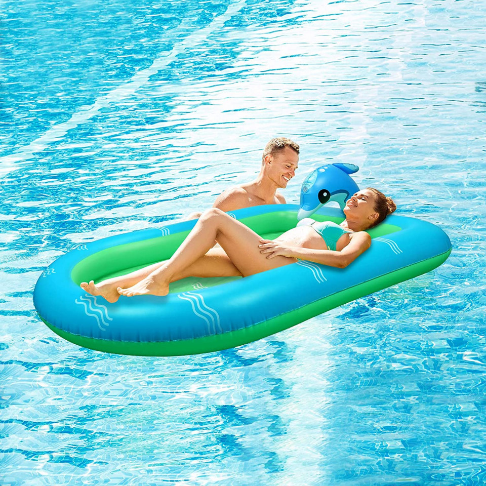 Este un bun ideal pentru relaxare în grădină. Multă distracție cu apa: atunci când stoarceți coloana de apă de la marginea covorașului, direcția apei poate fi schimbată. Acest lucru le permite copiilor să calce pe el și să adauge mai multă distracție. Detalii: Culoare: albastru/verde Material: PVC Dimensiune: 101 x 167 cm
