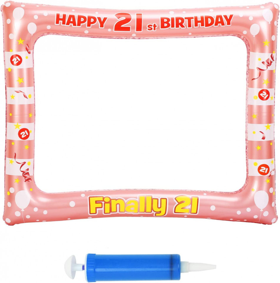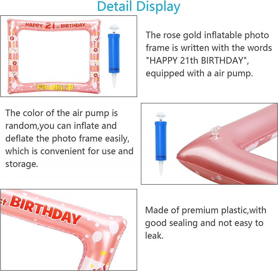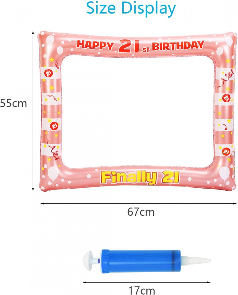 Rama foto gonflabilă cu fundal auriu roz este foarte atractivă pentru petreceri. Este imprimat cu cuvintele „La mulți ani de 21 ani”, „În sfârșit 21” și modele drăguțe precum panglici, stele, baloane etc. este echipat și cu o pompă de aer culoare aleatorie, astfel încât să o puteți umfla cu ușurință pentru decor. Detalii: Material: vinil Culoare: roz Dimensiune: 67x 55 cm