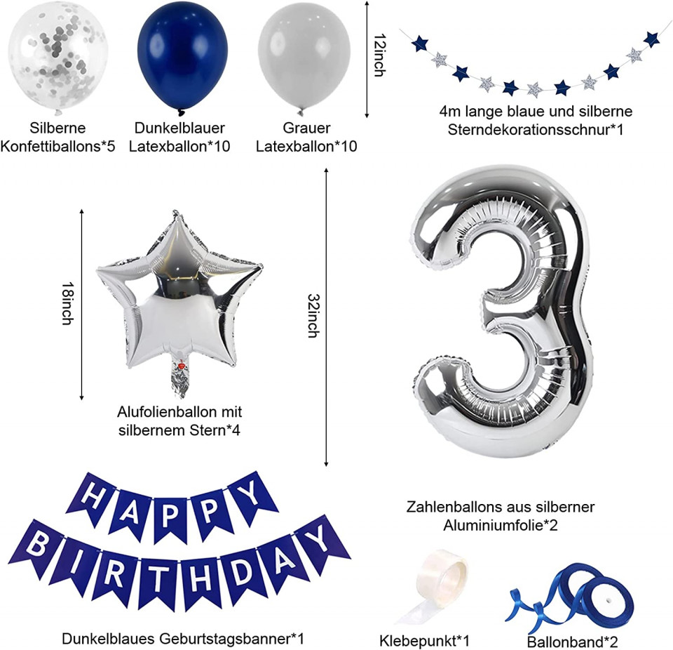 Etichete: 31 piese, Accesorii pentru petreceri, Aniversare, argintiu/alb/albastru, cifra 3, folie/latex, Set aniversar GRESAHOM