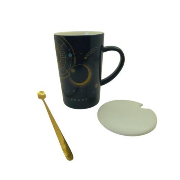 Set cana cu capac si lingurita, Design Spatiu cosmic, Albastru, 300 ml, Ceramica – Produs din sectiunea Home & Deco, categoria Vesela, pahare, tacamuri, subcategoria Seturi la pretul de 49 Lei; Producator: OEM
