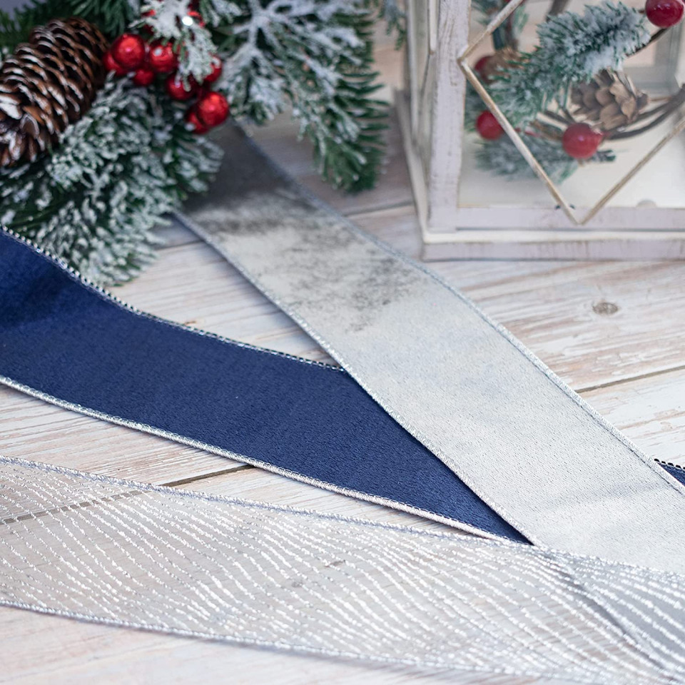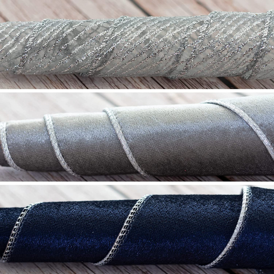 Aplicație largă: le puteți folosi pentru ambalarea cadourilor, decorarea casei, fabricarea de îmbrăcăminte, accesorii textile. De asemenea, este potrivit pentru coasere și tăiere pentru a întări cusăturile sau înfășurări pentru a lega marginile. Detalii: Culoare: gri/argintiu/albastru inchis Material: textil Lungime: 9,14 m Latime: 6,3 cm