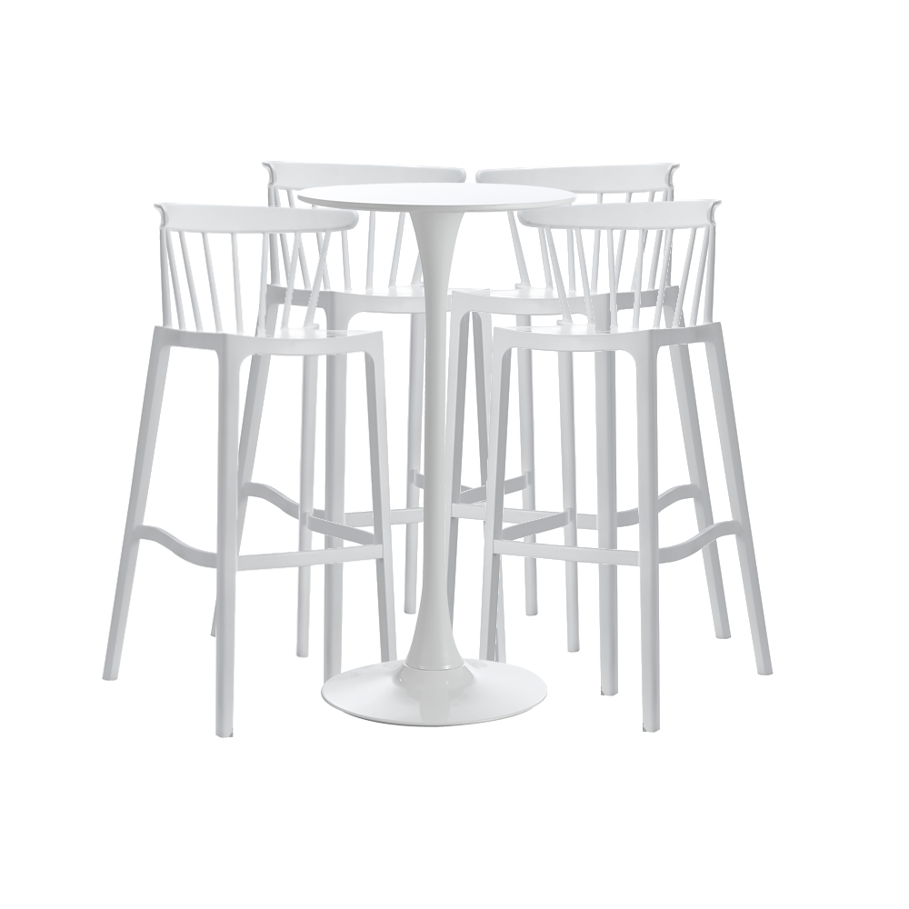 Set masa si scaune de bar RAKI ASPEN, 5 piese, masa alba 60x101cm cu 4 scaune albe 51x54x103cm Setul contine: – 1 x masa 60x101cm – 4 x scaune albe 51x54x103cm