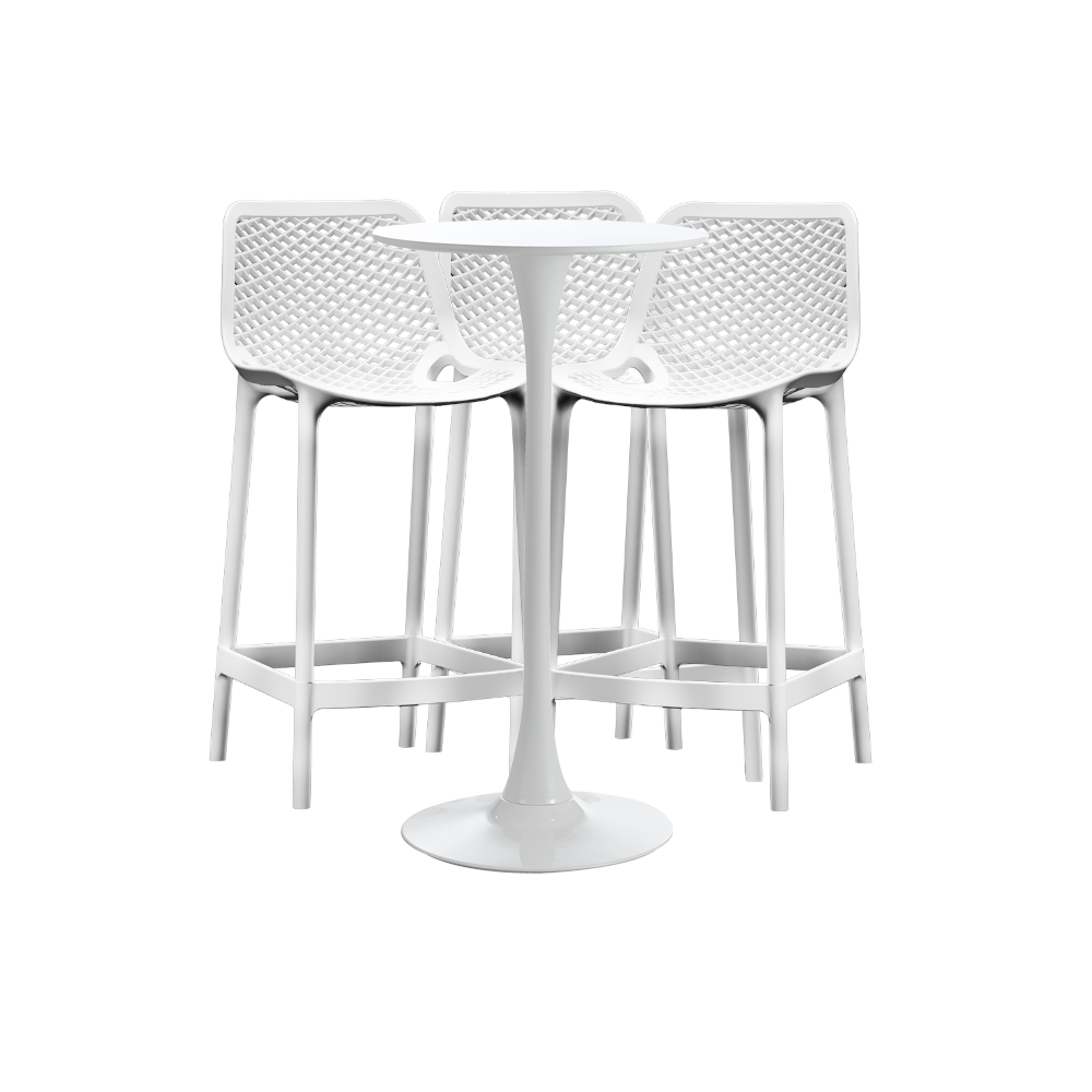 Etichete: 4 piese, Bricolaj, Gradina si Petshop, masa 60x101cm cu 3 scaune London Air 52x44x105cm, Raki, scaune si mese, Set masa si scaune de bar alb, Seturi