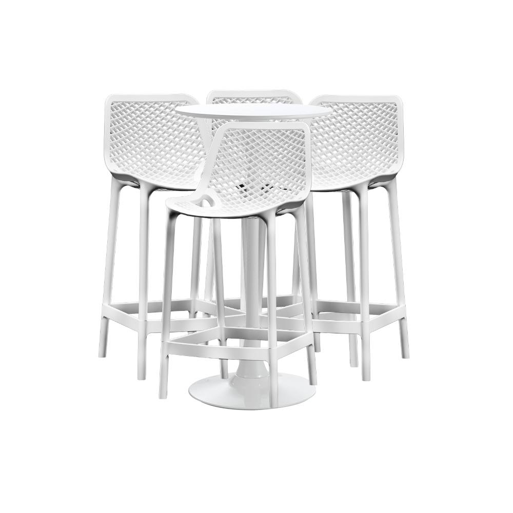 Etichete: 5 piese, Bricolaj, Gradina si Petshop, masa 60x101cm cu 4 scaune London Air 52x44x105cm, Raki, scaune si mese, Set masa si scaune de bar alb, Seturi