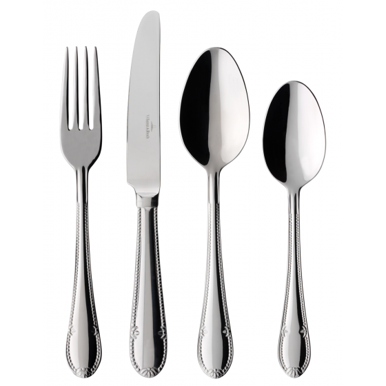 Brand:Villeroy&Boch Colectia:Mademoiselle Stil:14052 14051 Caracteristici:Setul include: 6 Linguri 6 Furculite 6 Cutite 6 Lingurite Pot fi spalate in masina de spalat vase. Material:14303 Dimensiuni:44x28x5cm cutia Greutate:1.87 Kg Observatii:Cutitele Villeroy & Boch sunt fabricate dintr-un inox special 13/0 care este mult mai dur decat inoxul 18/10 folosit la producerea celorlalte tacamuri. Astfel lama cutitelor ramane ascutita mai mult timp. In timpul procesului de clatire acest tip de inox dur 13/0 poate sa atraga rapid rugina. Pentru a evita acest lucru se recomanda plasarea unei bile din folie de aluminiu de dimensiunea unei mingi de golf in cosul de clatire. Aluminiul va atrage particulele de rugina si acestea nu se vor mai depune pe cutite.