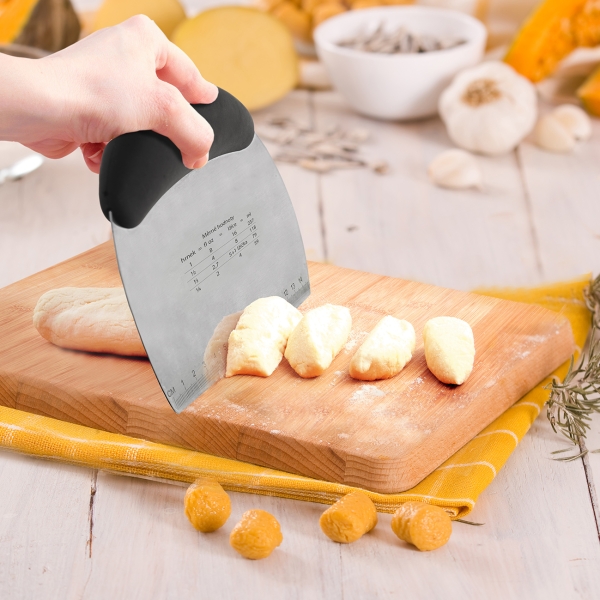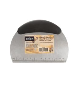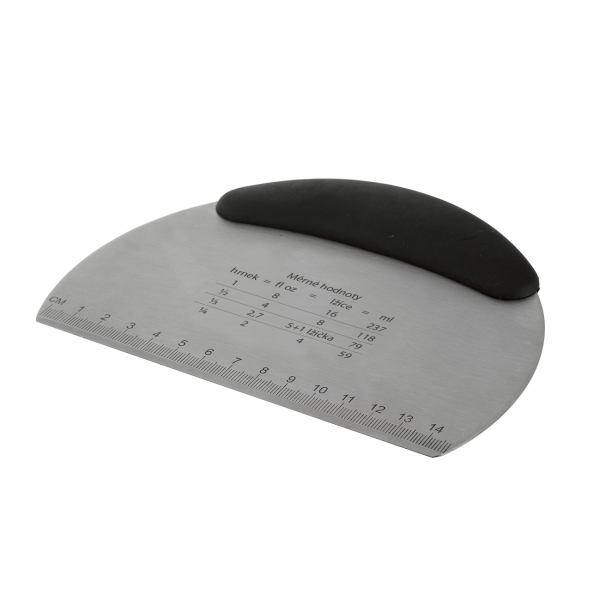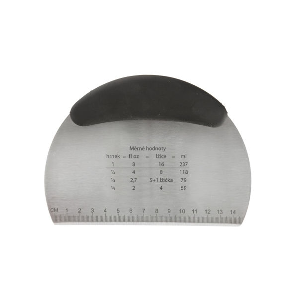 Spatula gradata pentru bucatarie, 16 x 12 cm. Spatula bucatarului este confectionata din inox cu maner de cauciuc si este conceputa pentru taierea si felierea legumelor gatite, a cartofilor sau pentru transferul ingredientelor de pe tocator in oala, eventual pentru curatarea suprafetei de lucru. Cu ajutorul acestei spatule, puteti taia aluatul intins in diferite forme. De asemenea, spatula poate fi folosita si pentru mutarea bucatilor de carne sau a legumelor intr-oala sau tigaie sau puteti taia usor si rapid legumele fierte, omleta sau oualele fierte, sa ridicati pizza de pe tava de copt etc. Spatula este gradata in cm de la 0 pana la 14,7 cm si prezinta rapoarte de conversie (cup-fl oz-spoon-ml). Manerul ergonomic din TPR si plastic PP se potriveste bine in mana. Spatula nu este doar usor de curatat, trebuie doar sa o spalati in apa calduta cu apa cu sapun, dar cu ajutorul ei poti indeparta si resturile de aluat, faina de pe masa de taiere sau suprafata de lucru. Material ; inox , TPR si PP pentru maner Dimensiuni: Lungime 16 cm x inaltime 12 cm.