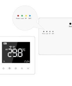 Prezentare Cablare Conectare aplicatie Manual TP618RFW Specificatii: Brand: Luxion Senzor temperatura: NTC Materiale folosite: PC + ABS Control digital touch panel Programare saptamanala 5+1+1 Display LCD mare tip back light Alimentare termostat: 2 baterii tip AA (nu sunt incluse) Alimentare receiver: 95-240VAC 10% 50/60Hz Frecventa RF: 868 MHz Conectivitate termostat: Wi-Fi 2.4 GHz Control termostat: Tactil sau prin aplicatia mobila Smart Life Sarcina maxima: 3A (Incalzire apa, incalzire boiler), 16A (Incalzire electrica) Interval temperatura camera: 5-35C Temperatura ambientala: 0-50C Histereza: 0.5C Dimensiune termostat: 86 x 86 x 28 mm Dimensiune receiver: 86 x 86 x 28 mm Tip instalare termostat: Pe perete/birou Tip instalare receiver: Pe perete Certificate: CE, RoHS Functie memorare: Termostatul memoreaza automat setarile pe care tu le faci! In acest fel acesta va pastra toate setarile savlate chiar si dupa o pana de curent. Functie programare: Termostatul poate fi programat dupa bunul plac. De exemplu in timpul zilei 9:00 – 17:00 temperatura sa fie 22C, iar in intervalul 17:00 9:00 temperatura in casa sa fie 25C! Termostatul este programabil 5+1+1 zile, cu 6 intervale orare pe zi. Blocare termostat: Blocheaza termostatul astfel incat copiii tai sa nu poate umbla la el! Protectie impotriva inghetului: Sistemul anti-inghet al termostatului monitorizeaza constant temperatura din incapere, iar atunci cand aceasta scade sub 10C, termostatul porneste automat sistemul de incalzire pentru a preveni inghetul apei in sistemul de incalzire!