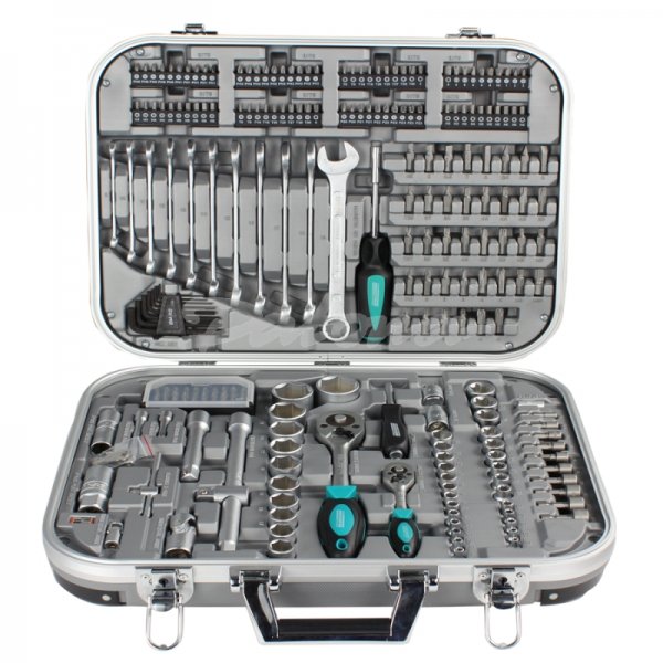 Clichet 6.3 mm (1 4 ) Clichet 12.5 mm (1 2 ) Prelungitor flexibil 140 mm 2 x prelungitor 50 mm, cca 100 mm si 2 x prelungitor 125 mm, cca 250 mm Adaptor universal Adaptor T Adaptor biti 12.5 mm (1 2 ) Adaptor 6.3 mm pentru surubelnita 6.3 mm Maner surubelnita Tubulare: 4; 4.5; 5; 5.5; 6; 7; 8; 9; 10; 11; 12; 13; 14; 15; 16; 17; 19; 20; 21; 22; 24; 27; 30; 32 mm Tubulare profil E 6.3 mm: E4; E5; E6; E7; E8 mm si 12.5 mm : E20; E22; E24 38 x biti lungime 30 mm 100 x biti lungime 25 mm 10 x capete biti: 5; 5.5; 6; 7; 8; 9; 10; 11; 12; 13 mm 11 chei combinate: la un capat fixe si la celalalt inelare: 8; 10; 11; 12; 13; 14; 15; 16; 17; 18 19 mm Imbus: 1.5-6.0 mm