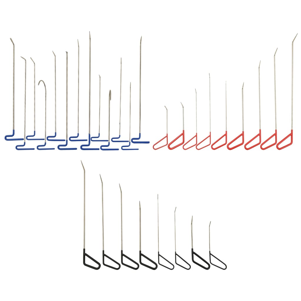 Acest set de tije cu cârlig formează un instrument practic și necesar cu ajutorul căruia se pot deschide ușor și în siguranță ușile și ferestrele și se pot repara deformările auto. Acest set conține cârlige cu lungimi multiple și diferite forme de mâner pentru a îndeplini diferite cerințe, astfel încât să puteți atinge locul dorit atât pe distanțe scurte, cât și pe distanțe lungi. Tijele de reparații sunt fabricate din oțel inoxidabil 304, ceea ce le face robuste, durabile și greu de îndoit. Aceste cârlige vă ajută să faceți față situațiilor neașteptate și de urgență în care poate fi implicat automobilul dvs. Culoare: Argintiu, roșu, albastru și negru Material: Oțel inoxidabil 304 Cârligele prezintă diverse lungimi Pachetul de livrare conține: 8 x Cârlig cu mâner negru (710/620/540/470/430/370/290/300 mm) 9 x Cârlig cu mâner roșu (720/630/550/470/430/410/370/290/280 mm) 13 x Cârlig cu mâner albastru (980/900/840/815/830/545/735/745/695/663/570/545/485 mm)
